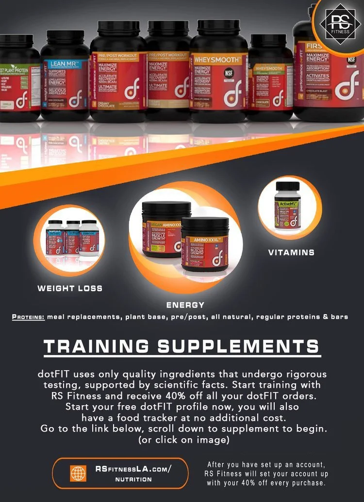 dotFIT uses only quality ingredients that undergo rigorous testing, supported by scientific facts. Start training with RS Fitness and receive 40% off all your DotFIT orders, & even if you do not sign-up we will still give you 40% off all orders as a thank you for giving us a try. Start your free DotFIT profile now, and click HERE to start.